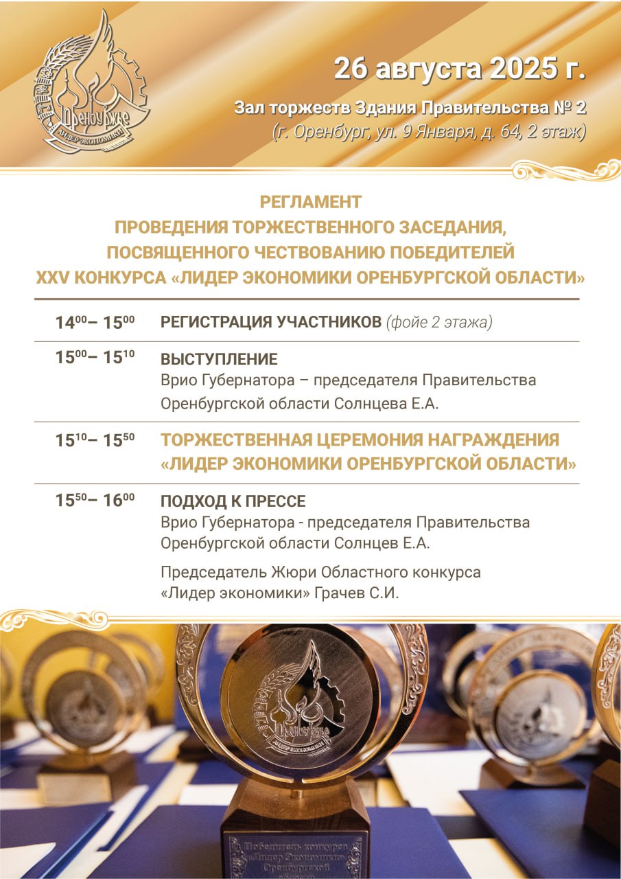 26 августа 2025г. (в 15.00 часов) в зале торжеств Здания Правительства № 2 (г. Оренбург, ул. 9 Января, д. 64, 2 этаж) состоится Торжественная церемония награждения призеров Юбилейного XXV Областного конкурса среди хозяйствующих субъектов и муниципальных образований «Лидер экономики».