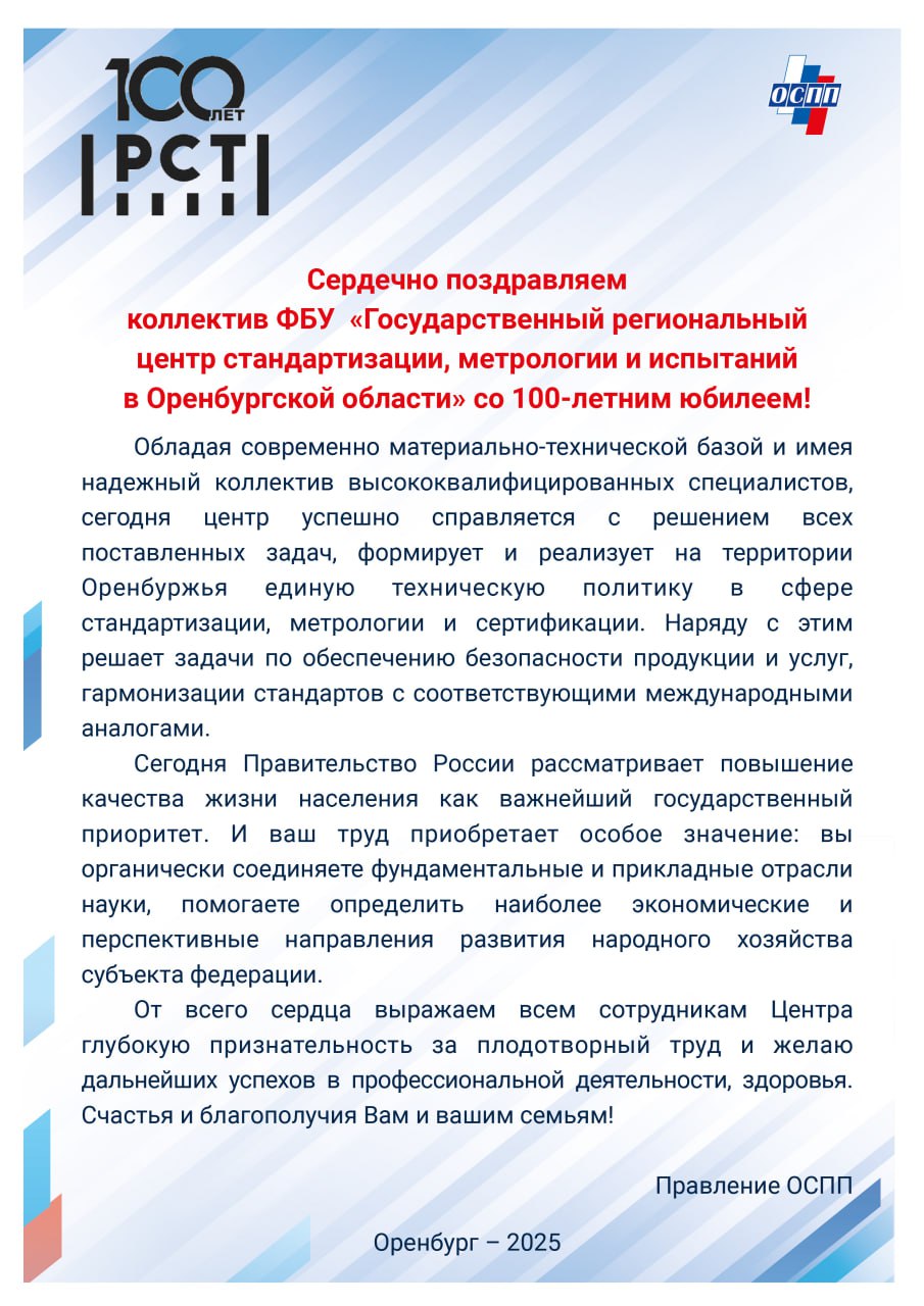Поздравляем коллектив ФБУ "Государственный региональный центр стандартизации, метрологии и испытаний в Оренбургской области" со 100-летним юбилеем!